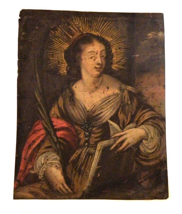 Inv. 281. Peintures, sur toiles, sur verre, sur bois et sur cuivre : peinture. Tableau rectangulaire entouré d'un cadre de bois doré, contenant, peinte sur cuivre et nimbée, sainte Barbe, vierge et martyre.