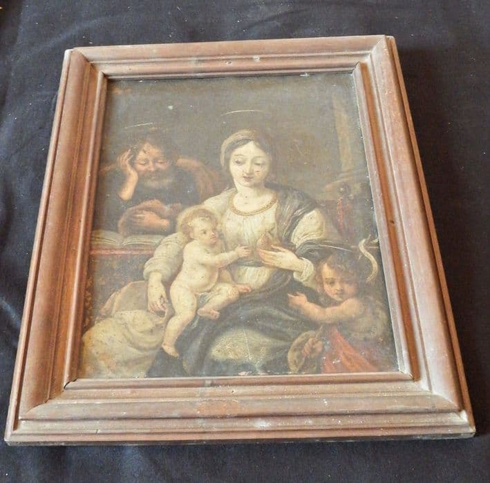 Inv. 288. Peintures, sur toiles, sur verre, sur bois et sur cuivre : peinture. Cadre de bois contenant une peinture sur cuivre qui représente la Vierge donnant un fruit à l'enfant Jésus. Tout auprès est le Précurseur tenant une croix dans sa main. Autour de la croix est une bandelette couverte de caractères hébreux. Au fond, saint Joseph feuilletant un livre.