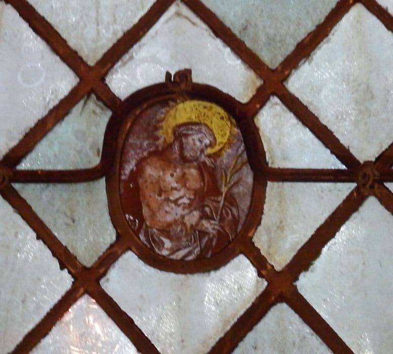 Inv. 297. Vitraux peints : Ecce homo (Christ au roseau). Grisaille jaune et violet manganèse, forme ovale.