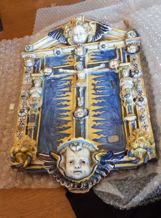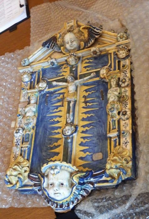 Inv. 298. Faïences, poteries, verreries : grand bénitier en faïence polychrome. Au milieu, le Christ en ivoire sur fond bleu rehaussé de rayures jaunes. Dans le haut taillé en toit, tête d'ange en relief. Dans le bas, bénitier creusé dans une tête d'ange. Sur les côtés formant cadre, deux jolies cariatides dont les gaines sont supportées par deux mufles de lion portant des anneaux. Autour de la croix quatre petites figures d'anges bouffis armés d'ailes. Autour du cadre semis de marguerites et ornements en relief.