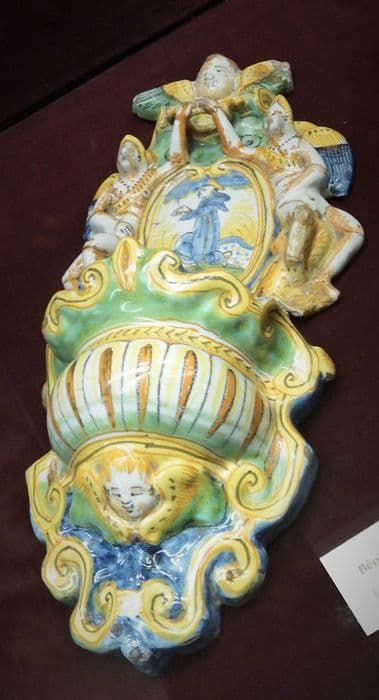 Inv. 301. Faïences, poteries, verreries : bénitier. Bénitier en faïence polychrome sur lequel on a peint un saint en prière (saint Bruno) dans un médaillon central, accosté de deux anges en haut relief. Têtes d'anges bouffis dans le haut et dans le bas.