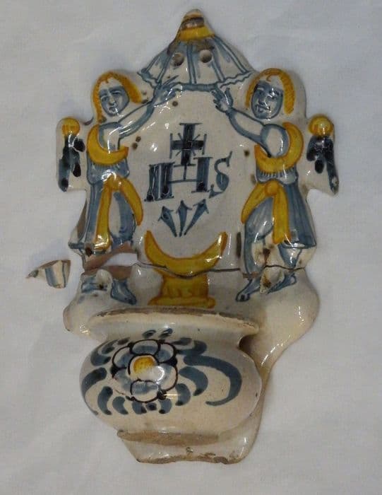 Inv. 303. Faïences, poteries, verreries : bénitier. Bénitier en faïence. Au milieu on a peint le monogramme IHS, accosté de deux anges en relief.
