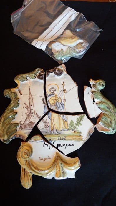 Inv. 304. Faïences, poteries, verreries : bénitier. Bénitier en faïence découpée sur lequel on a peint un saint pèlerin près d'une église.