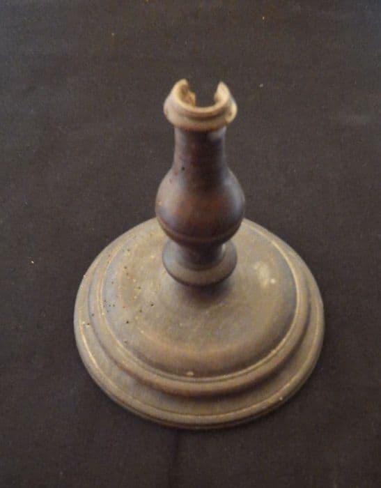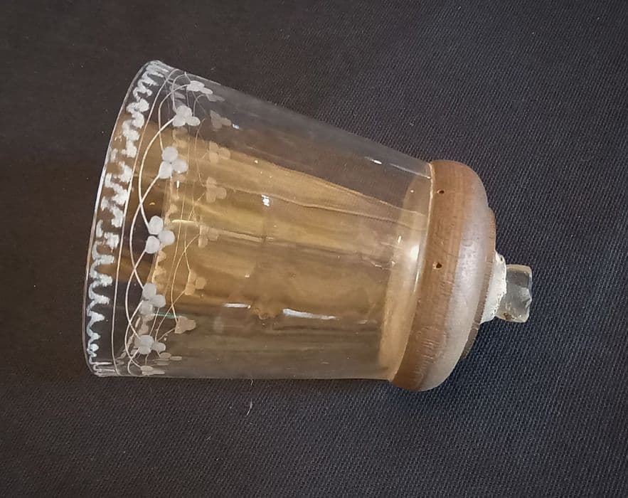 Inv. 318. Faïences, poteries, verreries : calice. Calice gobelet en verre dont le pied a été cassé et remplacé par un pied tourné en bois. Le gobelet a été décoré à la meule de trèfles et cordons.