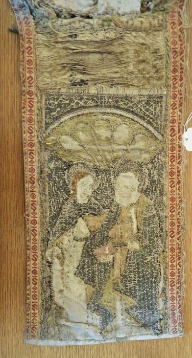 Inv. 325. Tapisseries : tapisserie. Bordure en tapisserie chargée de deux médaillons, surmontés chacun d'une arcade Renaissance, et dans chacun desquels se trouvent un saint et une sainte.