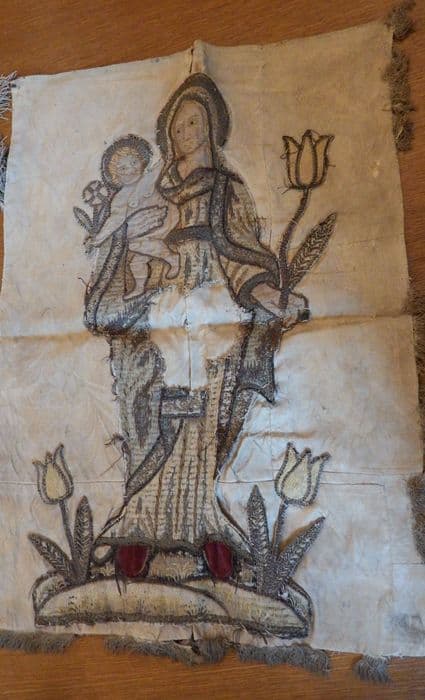 Inv. 326. Tapisseries : tapisserie. Bannière à fond de damas crème, frangée sur deux côtés, sur laquelle est brodée en tapisserie une Vierge ayant dans ses bras l'enfant Jésus, et tenant de la main droite une marguerite, et de l'autre une tulipe. Aux pieds de la Vierge sont deux tulipes. La partie médiane de la bannière est très déteriorée.