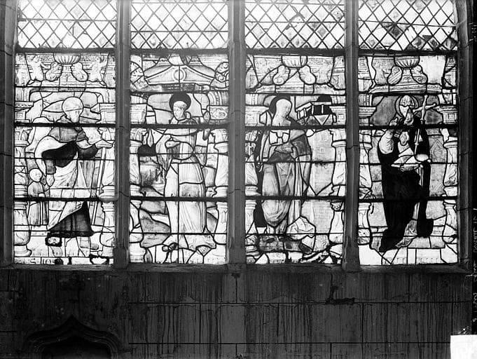 Quatre saints dans des arcatures de style Renaissance séparées par des balustres : saint Joseph, saint François, une sainte et un évêque. La partie supérieure est en vitre blanche.