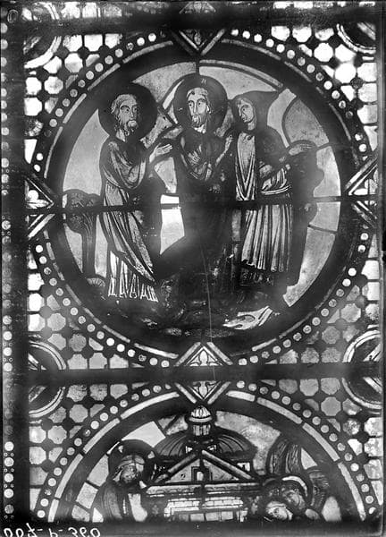 Q sur le plan. Fragments de scènes. Verrière à 2 lancettes qui contiennent chacune 7 médaillons.