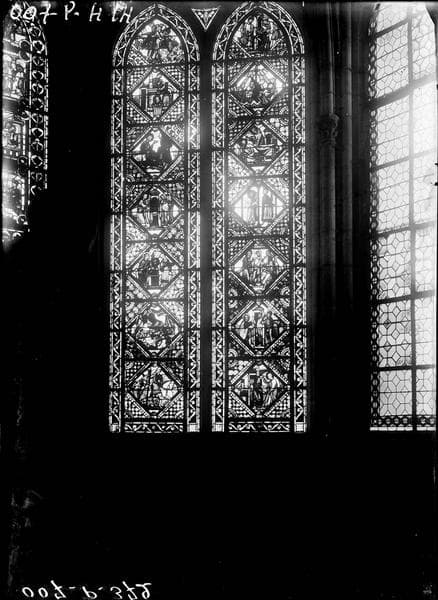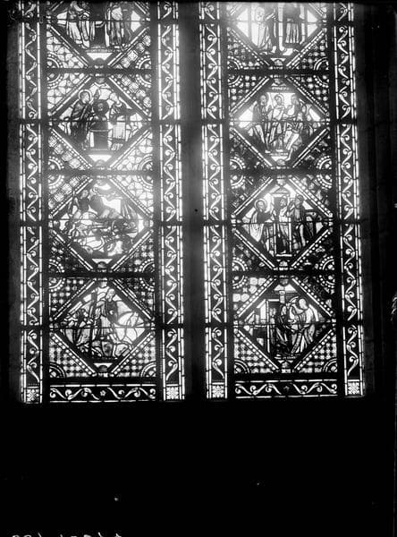 S sur le plan. Fragments de scènes. Verrière à 2 lancettes contenant chacune 7 losanges retraçant la vie de saint Paul.