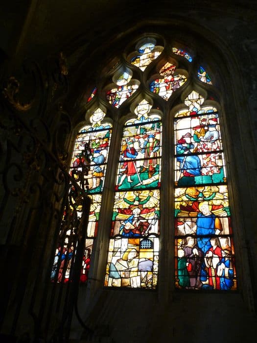 verrière : Le Songe de Joseph, Les Frères présentant à Jacob la tunique ensanglantée, Joseph resté dans la citerne, Joseph prisonnier, Joseph devant Pharaon, Donateur avec saint Jean l'Evangéliste et saint Pierre