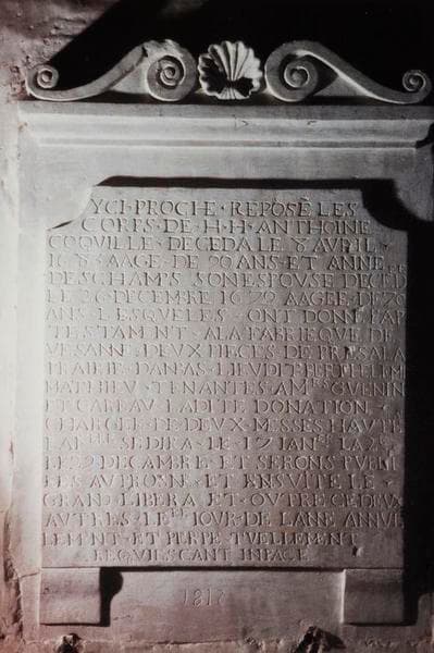 plaque funéraire : plaque obituaire d'Anthoine Coquille (+ 1685) et d'Anne Deschamps (+ 1678)