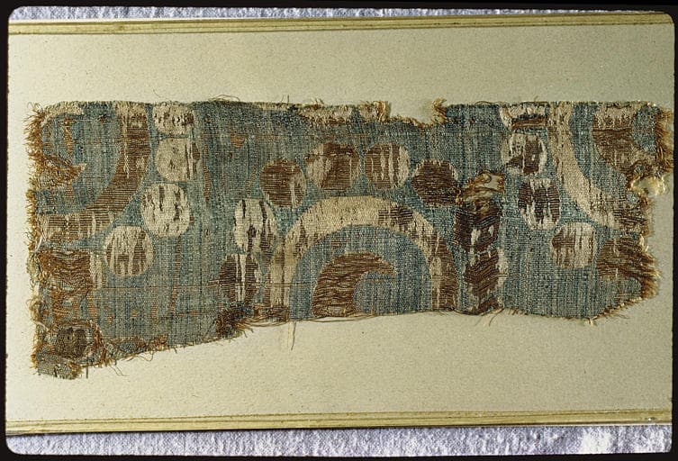 Sur le fragment rectangulaire, se répètent sur fond bleu des médaillons perlés, meublés d'un croissant.