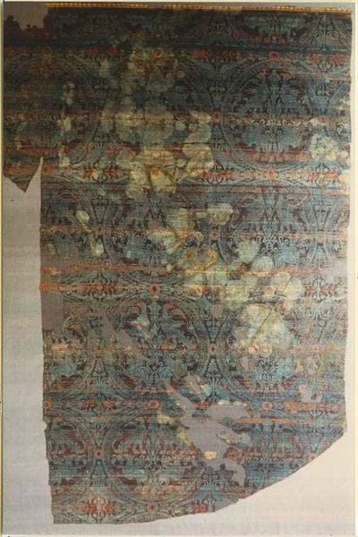 Samit en soie à dessins bleus et rouges.