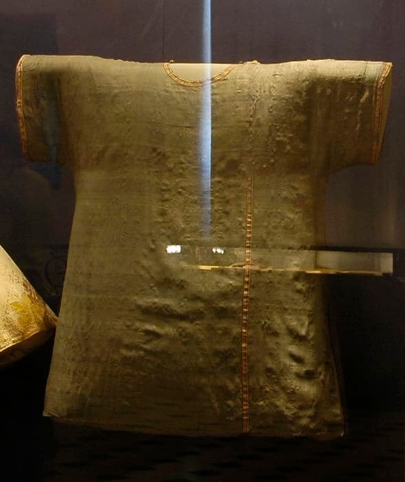 Cette tunicelle en soie violette légère est décorée de deux galons verticaux (celui de droite a disparu) ; le même galon borde les manches et le col, qui est fermé par deux boutons de cuivre.