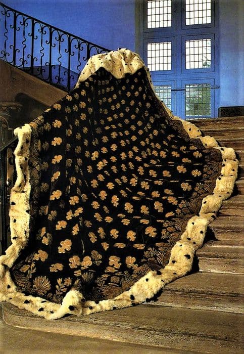 Grand manteau de velours violet, brodé de fils d'or. Mantelet et bordure en fausse hermine.