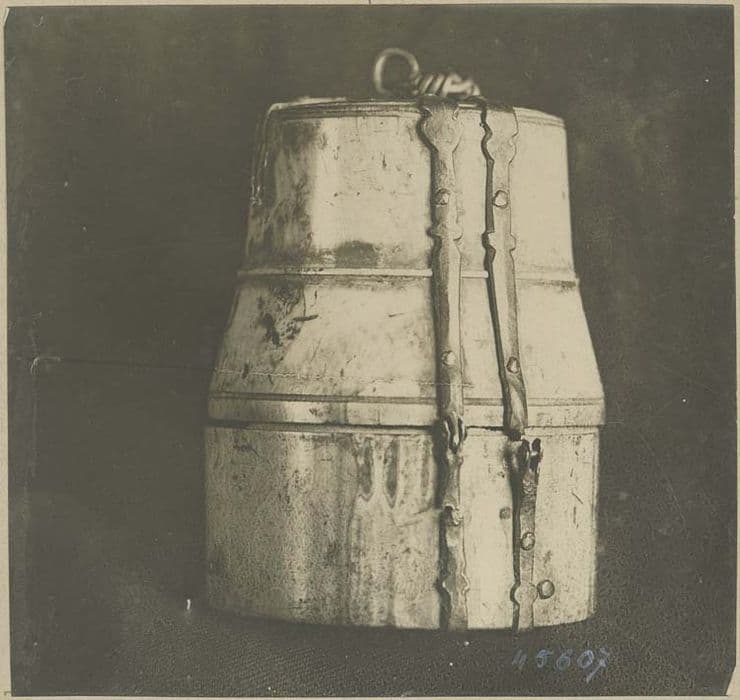 Boîte cylindrique sommée d’un couvercle élevé en forme de cloche, gravé à la base, en haut et à mi-hauteur d’un filet. Les disques qui forment le fond du tonnelet et le dessus du couvercle sont fixés par des attaches d’argent. Charnière et pièces de fermeture en argent.