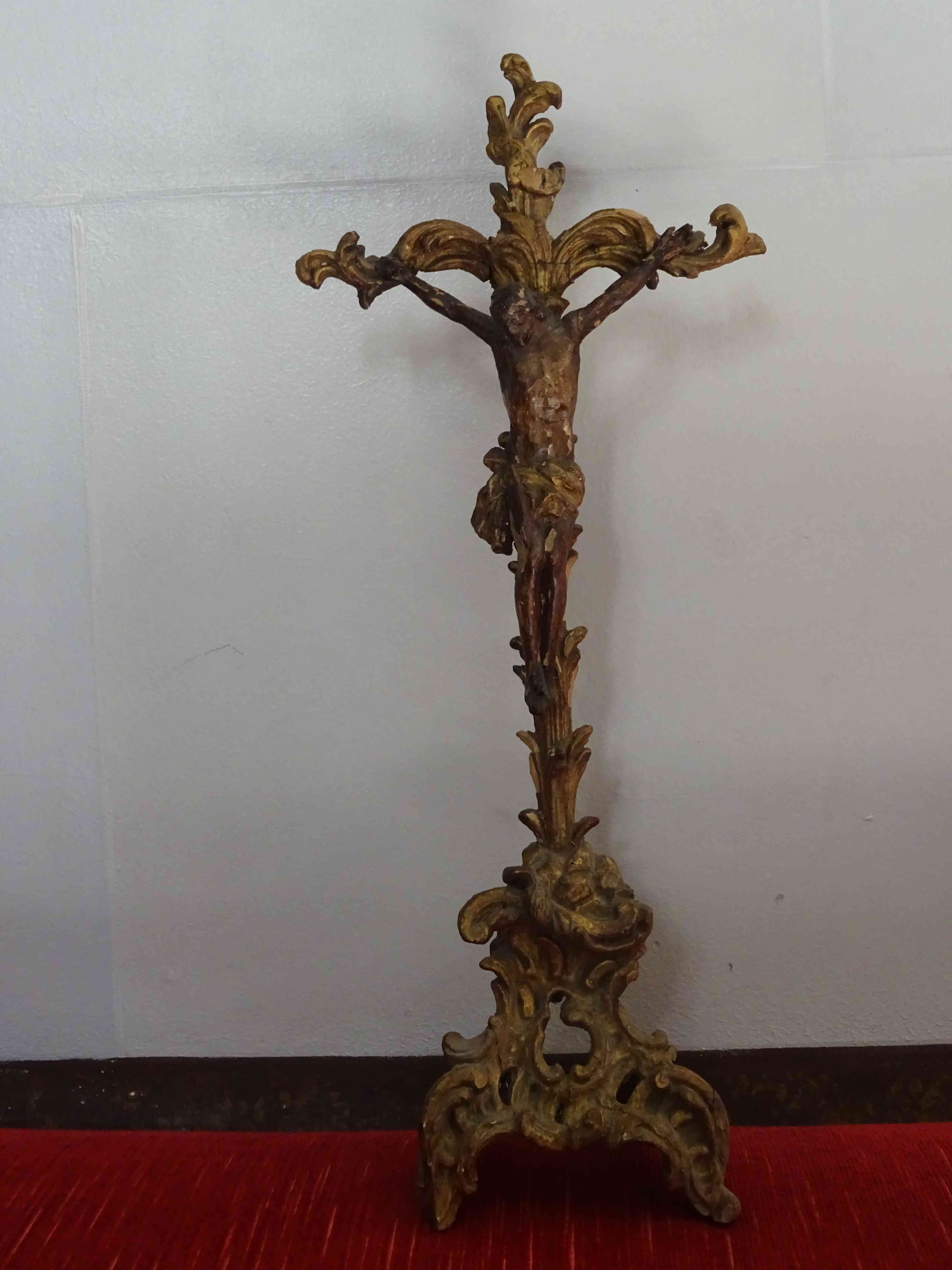 Le corps du Christ est cloué sur une croix sculptée en forme de palmier dans un style Rocaille