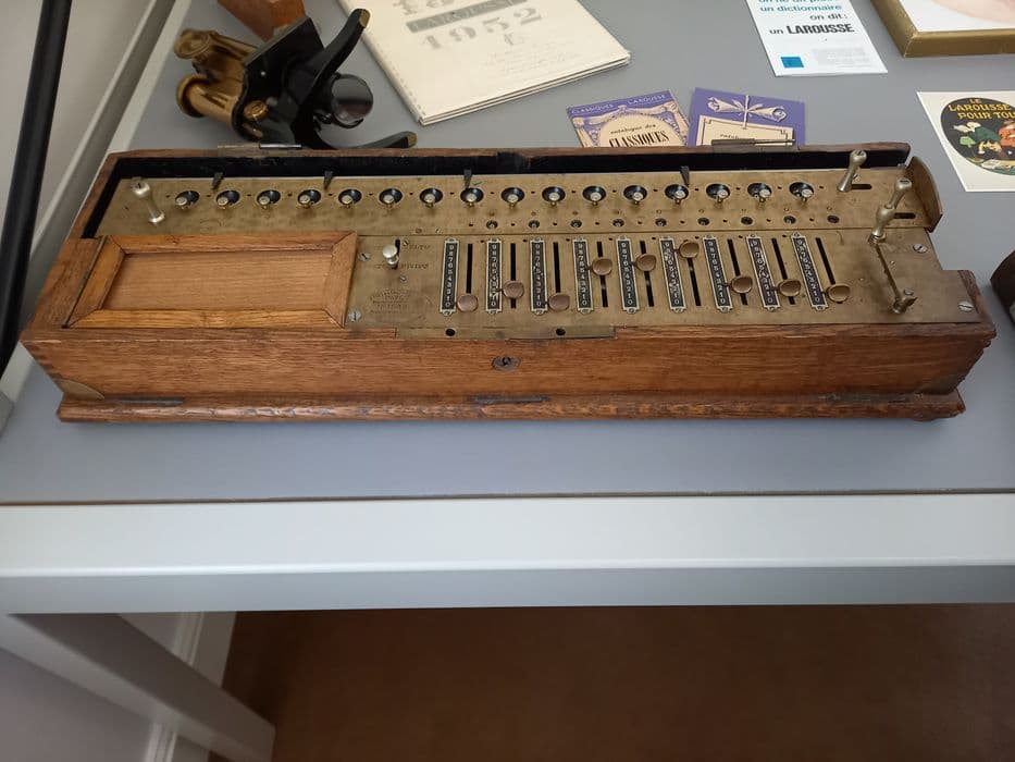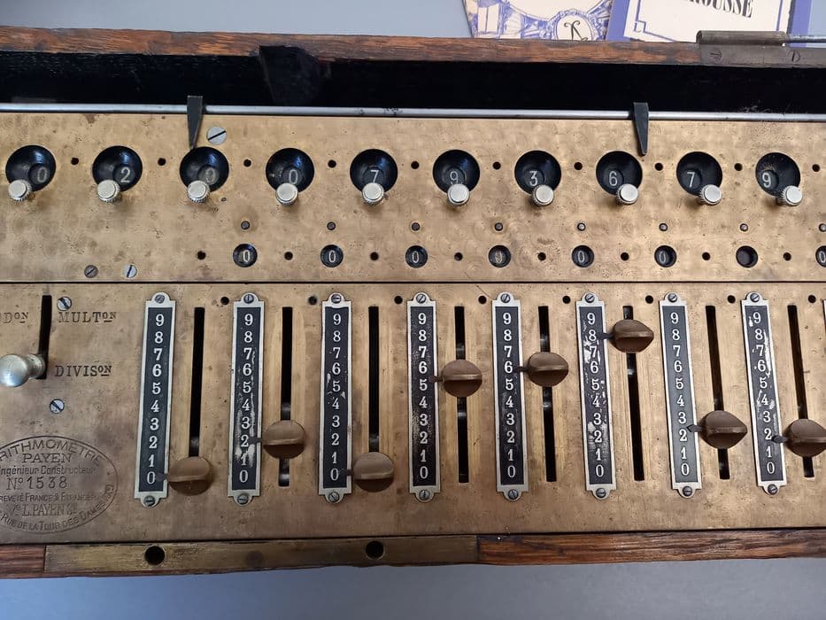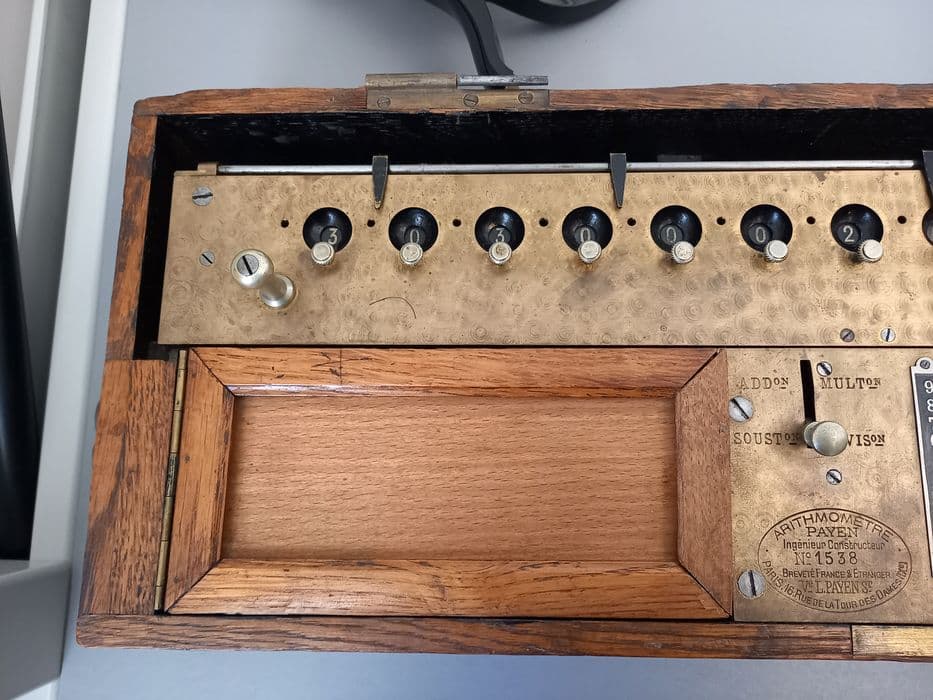 Il s’agit d'une machine à calculer, qui ressemble à la pascaline. 'est un instrument en bois et laiton de forme allongée, le couvercle se fixe grâce à des charnières qui s'emboîtent dans la caisse de l'objet. Une partie du dessus de la boîte est est amovible et sert de réserve. Le dessus est entièrement recouvert d'une plaque de laiton rivetée avec des manivelles, un compteur, des boutons et des plaques numérotées. Un levier sert aux additions et aux multiplications et aux soustractions/divisions. La machine est contenue dans la boîte en chêne. La platine (partie?) en bronze se compose d'une partie fixe et d'un chariot mobile. Sur la partie fixe on distingue de droite à gauche : la manivelle d'entraînement qui est repliable ; les curseurs d'inscription ; le levier d’addition et de soustraction ; la plaque en verre dépoli pour l'inscription des résultats intermédiaires.