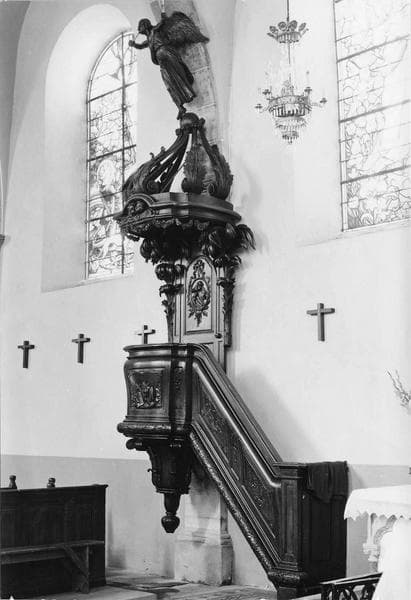 Chaire suspendue à culot composé de deux étages galbés. Escalier droit à droite, cuve semi-circulaire galbée, abat-voix plat surmonté d'une couronne fermée et d'un ange jouant de la trompette, dorsal encadré par deux palmiers.