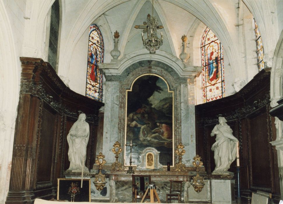 Tableau provenant du prieuré de Saint-Eloi, près de Chilly. Ce tableau a remplacé en 1791 au-dessus de l'autel, un christ en marbre qui fut transporté à l'église Saint-Louis de Versailles où il existe encore. Il fut commandé à Simon Vouet par l'abbé d'Effiat, prieur commendataire de Saint-Eloi, en souvenir du miracle par lequel, en 1357, Pierre de Guéméné, évêque de St-Pol de Léon, malade à Chilly, fut guéri par les trois Maries, à qui on garda un culte spécial.