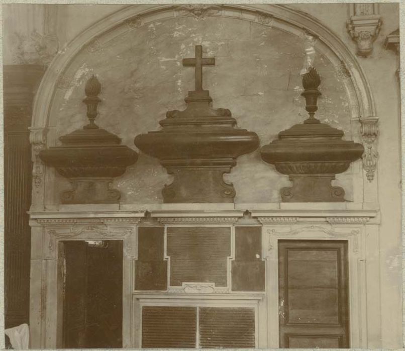 En forme de sarcophages surmontés l'un d'une croix et les deux autres d'un pot à feu. Le tout encadré dans une arcade soutenue par deux consoles sculptées, avec tête d'ange à l'amortissement. Trois tablettes, encadrées de moulures, portaient des inscriptions qui ont été effacées au ciseau.