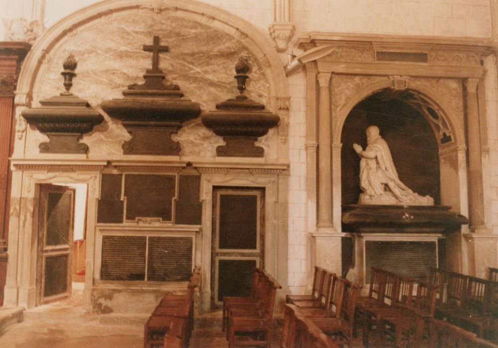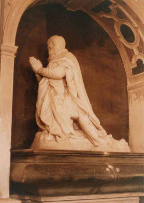 Cénotaphe en marbre noir, surmonté d'une statue représentant le défunt agenouillé, en marbre blanc, le tout placé sous une arcature cintrée.