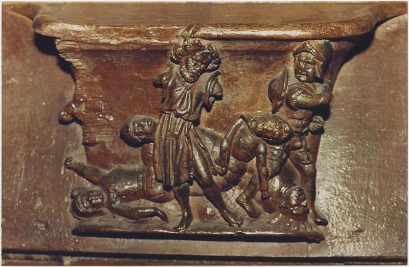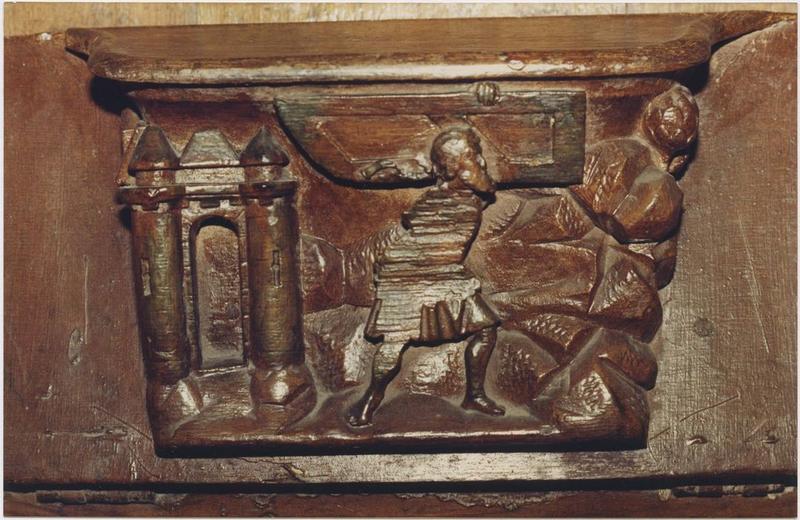 Stalles du choeur. Elles représentent des apôtres, des scènes de la création de l'homme et du paradis terrestre, de l'histoire de Samson, ainsi que de fines arabesques.