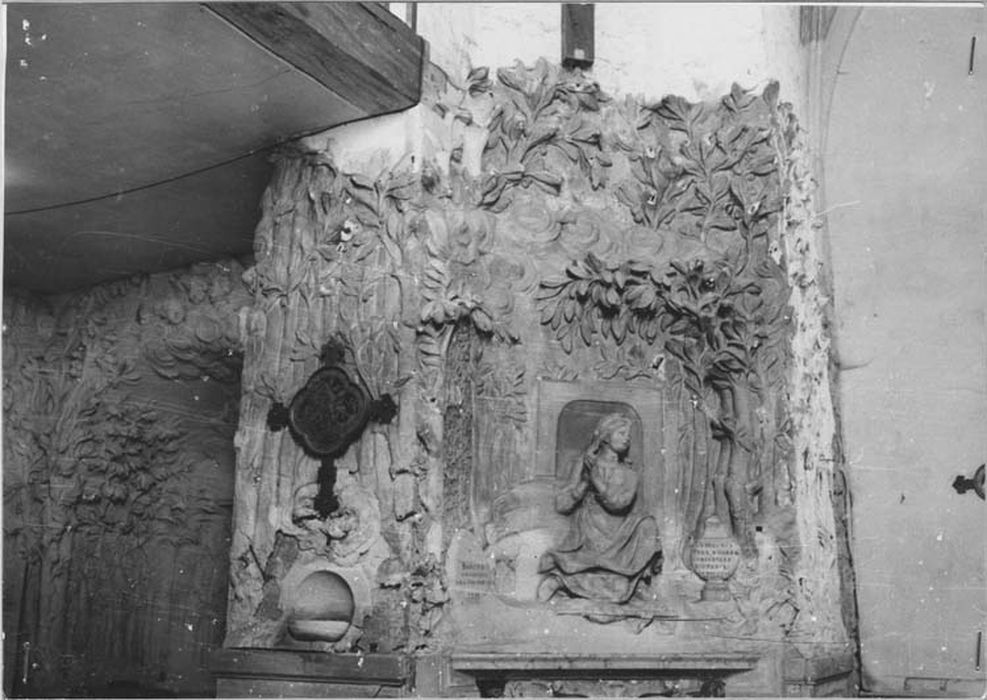 Sorte d'oratoire peu profond à 5 pans, aménagé contre le mur du clocher, entre la chapelle des fonts baptismaux et l'entrée de la nef. Il est entièrement revêtu de gypserie. En soubassement des panneaux rectangulaires de teinte rosée. Le panneau central est surmonté d'une console reposant latéralement sur deux volutes rouge foncé, et au centre sur un cartouche rocaille surmonté d'une agrafe végétale et d'un trophée d'instruments de jardinage (bêche, houe, râteau). Au-dessus un foisonnant décor en moyen relief, de couleur blanche : lierre, arbres, arbres fruitiers, et quelques nuées. Au-dessus de la console une représentation en quasi ronde-bosse de sainte Geneviève en bergère, agenouillée en prière, la quenouille à ses pieds.