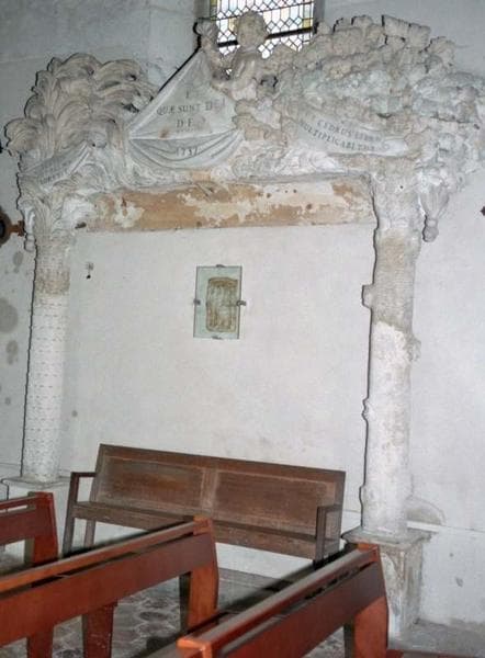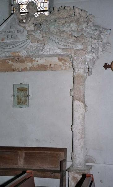 Fronton triangulaire reposant sur deux fûts de colonnes en forme de troncs de palmiers. Au centre du fronton un ange debout tend la partie centrale d'une draperie, dont les extrémités nouées retombent de part et d'autre des colonnes. Du côté gauche du fronton, gros bouquet de palmes, du côté droit gros bouquet de fleurs.