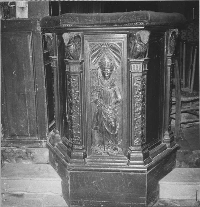 Chaire à trois panneaux hexagonaux, sur le panneau de face : sans doute la statue de saint Thomas Beckett, en bas-relief ; aucune sculpture dans les deux autres panneaux ; bustes d'anges ailés sculptés aux angles, avec la face arasée.