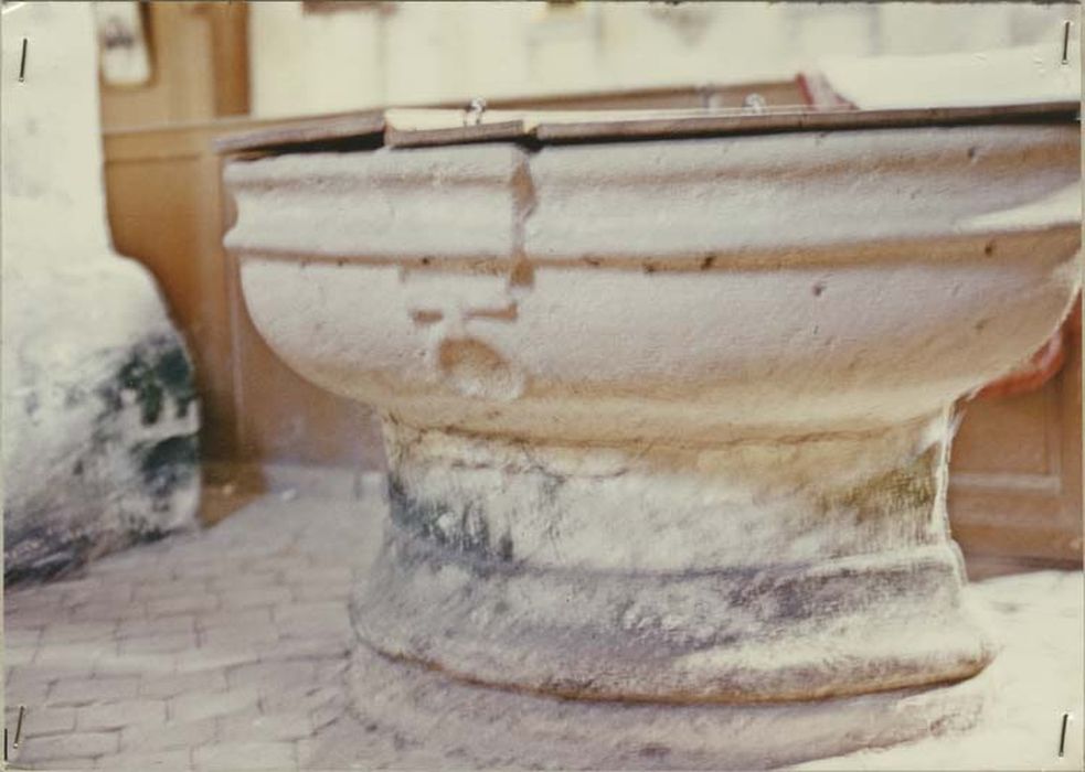 Fonts en forme de navette et sans ornement ; large gorge autour de la vasque et deux anneaux de pierre ; couvercle bois rajouté.