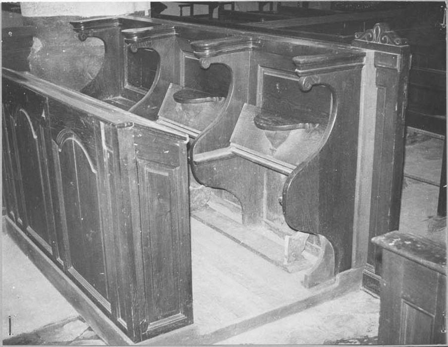 Ensemble de stalles avec accoudoirs, disposées en U face à l'autel ; trois de chaque côté d'une ouverture. Les parties latérales sont munies de bancs, dont les places sont numérotées ; ornementation simple : motif géométrique identique pour chaque panneau ; d'après la découpe des panneaux, un certain nombre stalles semble avoir été supprimées ; inscriptions gravées ds les sièges en chiffres arabes (1 à 28).
