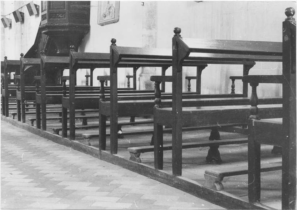 Trente huit bancs répartis dans les deux nefs ; onze bancs portent des numéros gravés dans le bois 17bis 27 ; assemblage par chevilles ; aucune trace de clou ; travail exécuté à la main ; traces d'outils encore visibles ; supports des bras en bois tourné, presque tous différents ; dimensions variables.
