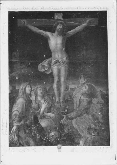 Christ en croix, légèrement déhanché ; tête penchée sur la droite se détachant sur des nuages sombres ; inscription au-dessus de la croix Jesus ; partie inférieure : devant Jérusalem, trois personnages : saintt Jean agenouillé (draperie rouge volant au vent) ; Marie à genoux (voile bleu) ; Madeleine cheveux blonds déroulés ; armoiries à droite presque effacées.