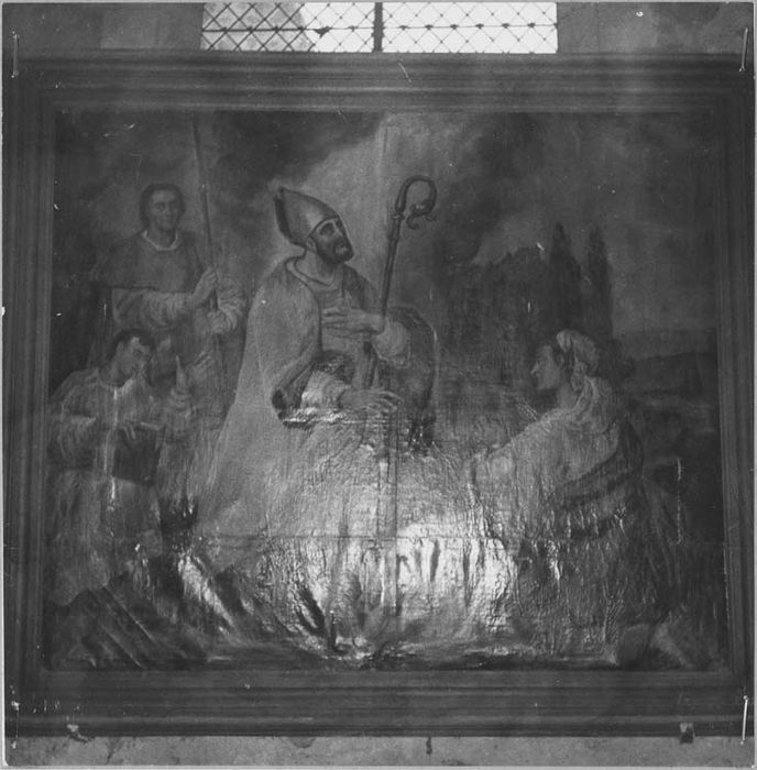 saint Sulpice ; évêque ; bénédiction ; résurrection ; enfant ; femme ; abbé ; fond de paysage ; rivière