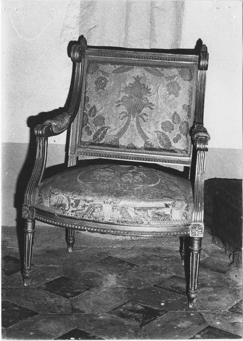 Fauteuil en bois doré recouvert de tapisserie. Décor à volutes.
