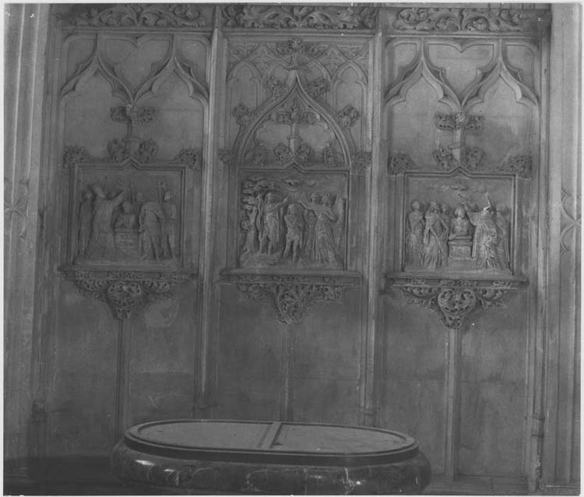 Trois scènes intégrées dans des encadrements de style gothique : le Baptême du Christ entouré du Baptême de Clovis et d'un baptême non identifié.