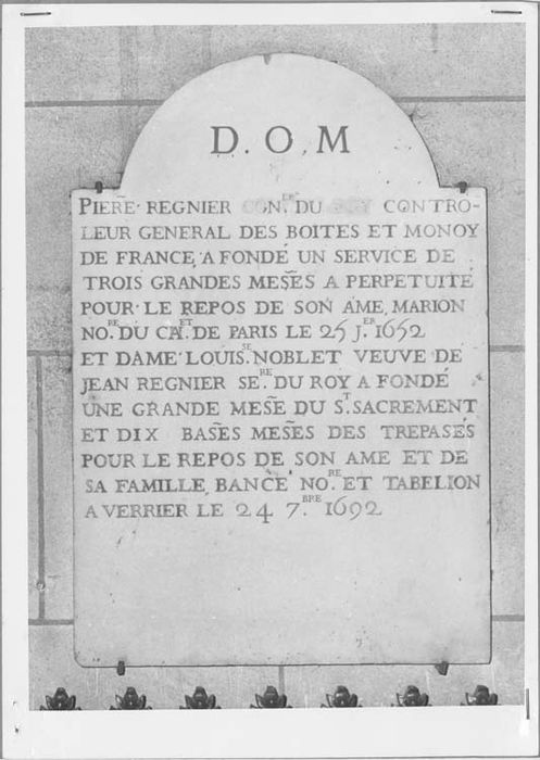 Inscription gravée : D.O.M / PIERE REGNIER CONER. DU ROY CONTRO- / LEUR GENERAL DES BOITES ET MONOY / DE FRANCE, A FONDE UN SERVIDE / TROIS GRANDES MESES A PERPETUITE / POUR LE REPOS DE SON AME, MARION / NORE. DU CAET. DE PARIS LE 25 JER. 1652 / ET DAME LOUISSE. NOBLET VEUVE DE / JEAN REGNIER SERE. DU ROY A FONDE / UNE GRANDE MESE DU ST. SACREMENT / ET DIX BASES MESES DES TREPASES / POUR LE REPOS DE SON AME ET DE / SA FAMILLE, BANCE NORE. ET TABELION / A VERRIER LE 24 7BRE. 1692 .