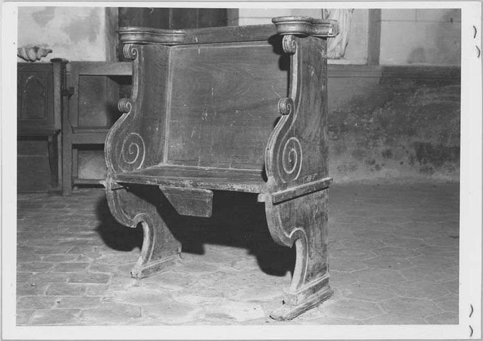 Stalle en chêne (peint en faux bois) ; seul élément persistant d'un ensemble de stalles démantelé : dossier droit, deux jouées chantournées avec accoudoirs à volutes, miséricorde de forme trapézoïdale et pieds également chantourné.