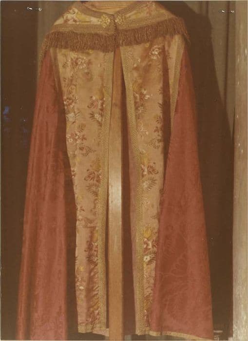 Soie damassée rouge et vieux rose pour chaperon, bandes latérales.
