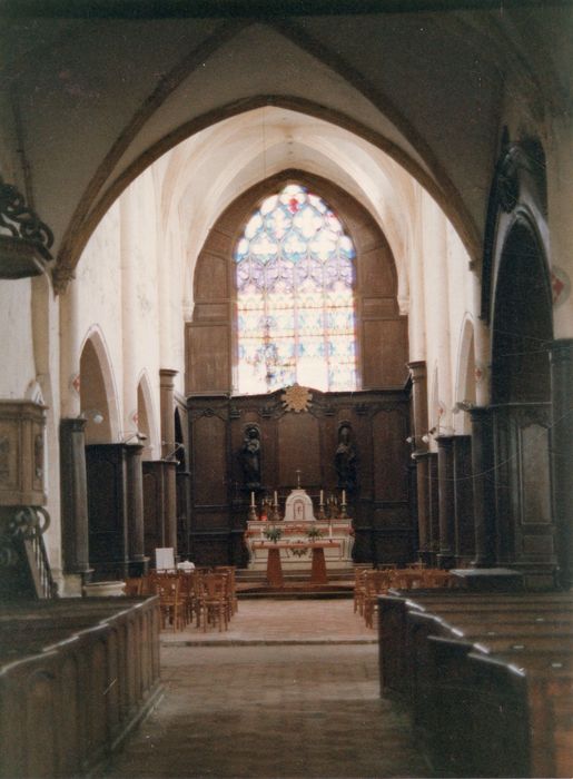 Maître-autel en bois peint blanc et or, tabernacle en marbre blanc. Autel en forme de gloire ; motif central de la colombe dans une gloire.