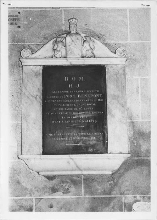 Epitaphe gravée : D. O. M. / H. J. / ALEXANDRE BERNARD ELISABETH / MARQUIS DE PONS RENNEPONT / LIEUTENANT GENERAL DES ARMEES DU ROI / CHEVALIER DE L'ORDRE ROYAL / ET MILITAIRE DE ST. LOUIS / NE AU CHATEAU DE ROCHE SUR ROGNON / LA 20 AOUT 1751 / MORT A PARIS LE 6 MAI 1829. / AIME ET REGRETTE DE TOUS LES SIENS / SA FEMME LE REJOINDRA ICI.