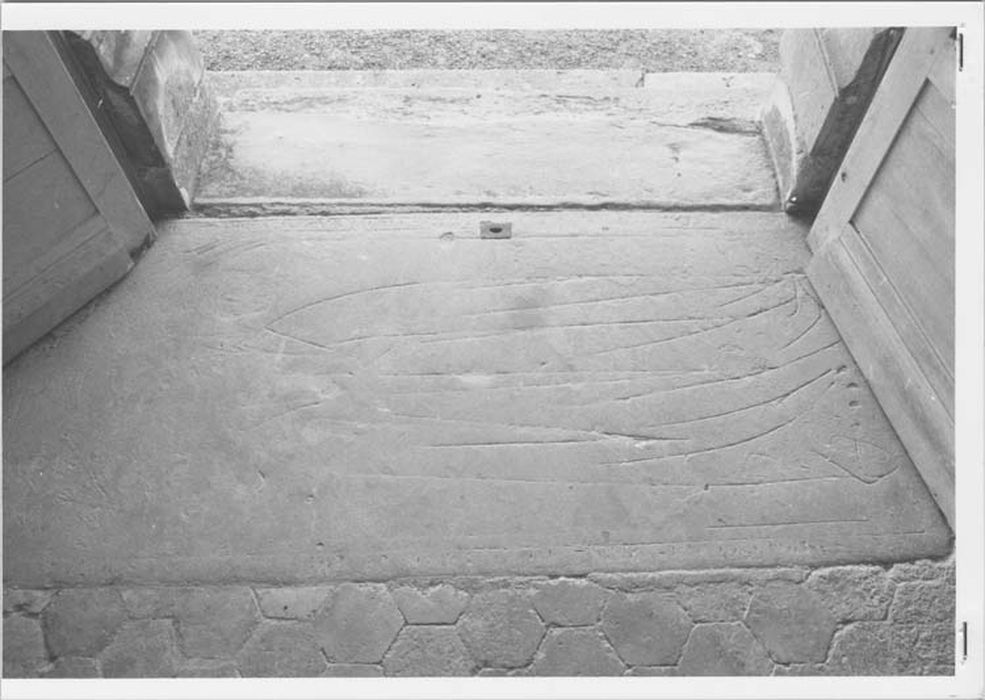 On devine les plis simples du vêtement du gisant ; quelques lettres apparaissent de l'inscription gravée en creux, sur le pourtour de la dalle.