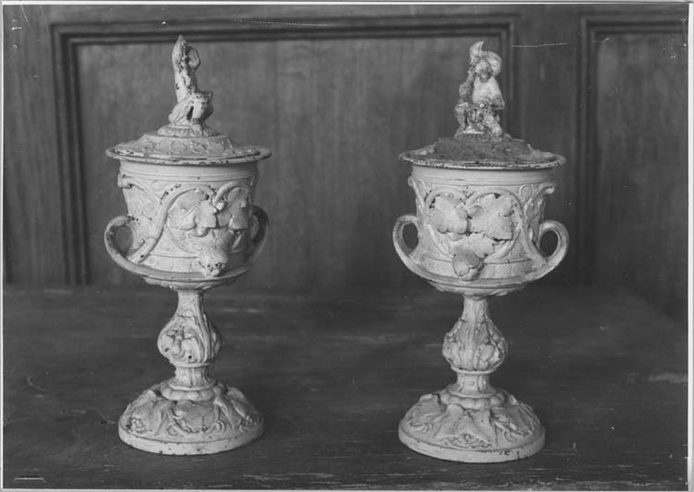 Coupe à deux anses ; rinceaux et feuilles de vigne ; pied et nud couverts du même feuillage ; couvercle surmonté d'un putto assis. Etain peint ; plomb ? ; décor en bas-relief ; peint blanc.