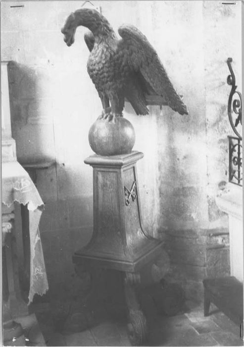 Aigle aux ailes déployées, supportant le lutrin dont les serres reposent sur un globe ; base quadripode avec terminaison à volutes, soutenant en partie médiane un fût carré orné des clefs de saint Pierre ; assemblage ?