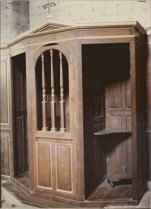 Inventaire mobilier, 1906 : Confessionnal en bois verni dans la chapelle du Sacré Cur. ; Laurence Mayeur (conservateur des antiquités et objets d'art de l'Essonne)