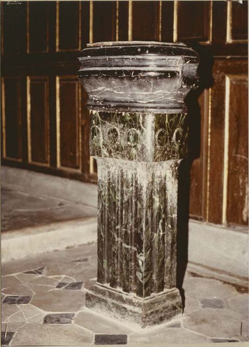 Inventaire mobilier, 1906 : Fonts baptismaux scellés, cuvette en marbre. ; Laurence Mayeur (conservateur des antiquités et objets d'art de l'Essonne)