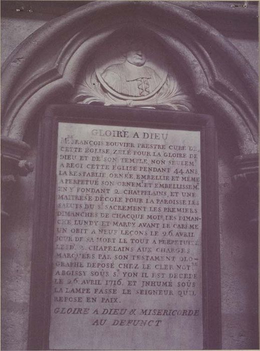 Epitaphe gravée : GLOIRE A DIEU / MRE. FRANCOIS BOUVIER PRESTRE CURE DE / CETTE EGLISE, ZELE POUR LA GLOIRE DE / DIEU ET DE SON TEMPLE, NON SEULEMT. / A REGI CETTE EGLISE PENDANT 44 ANS, / LA RESTABLIE, ORNEE, EMBELLIE ET MEME / A PERPETUITE SON ORNEMT. ET EMBELLISSEMEMT. / EN Y FONDANT 2. CHAPELAINS, ET UNE / MAITRESE DECOLE POUR LA PAROISSE LES / SALUTS DU ST. SACREMENT LES PREMIERS / DIMANCHES DE CHAQUE MOIS, LES DIMAN- / CHE, LUNDY ET MARDY AVANT LE CAREME / UN OBIT A NEUF LECONS LE 26 AVRIL / PUR DE SA MORT LE TOUT A PERPETUITE / LESDT. 2. CHAPELAINS AUX CHARGES / MARQUEES PAR SON TESTAMENT OLO- / GRAPHE DEPOSE CHEZ LE CLER NOTRE. / ABGISSY SOUS ST. YON IL EST DECEDE / LE 26 AVRIL 1716. ET INHUME SOUS / LA LAMPE FASSE LE SEIGNEUR QU'IL / REPOSE EN PAIX. / GLOIRE A DIEU & MISERICORDE / AU DEFUNCT.