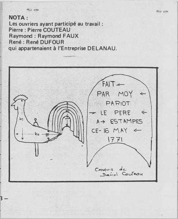Dessin (croquis) réalisé par Daniel Couteau ; Laurence Mayeur (conservateur des antiquités et objets d'art de l'Essonne)
