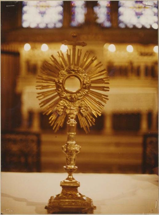 Ostensoir en vermeil. Pieds quadripodes à patte de lion ; base rectangulaire ; agneau pascal, godrons, palmettes, guirlande de feuillage ; collerette ; noeud à renflement, orné de têtes d'angelots et feuilles de chêne ; cannelures ; grappes de raisin ; autour de l'emplacement de la lunule : nuée chargée de têtes d'angelots, gerbes de blé, pommes de pin, fleurs et feuillage ; soleil sommé d'une croix latine fleuronnée.